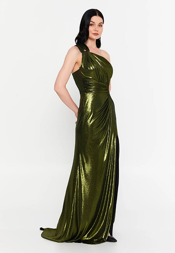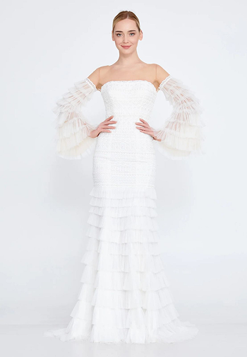 Asymmetric Off-Shoulder Beaded Gown With Overskirt